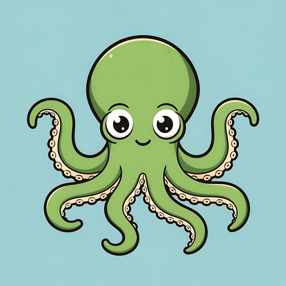 A cute green octopus with big sparkling eyes and eight wavy tentacles is illustrated in a cartoon style. It has a happy expression and smooth outlines on a solid light blue background. The design is simple and isolated for easy use.