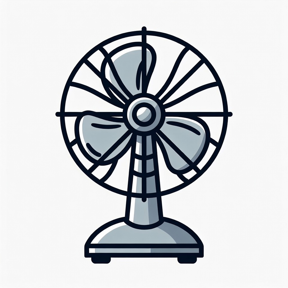 air fan, blades, cartoon fan, clipart, cooling fan, fan, fan icon, flat design, gray fan, household fan, icon, illustration, line art, pedestal base, simple fan, standing fan, table fan, vector art, white background, electric fan