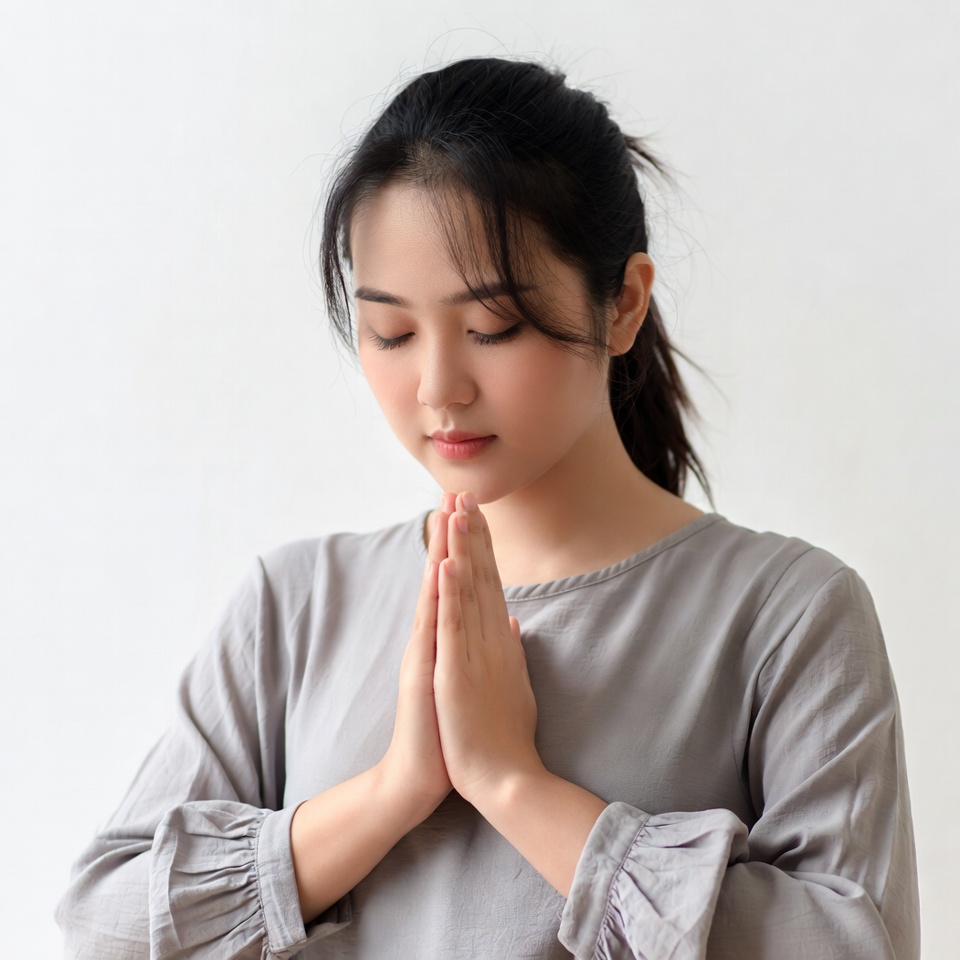 A young Asian woman with long dark hair tied in a ponytail stands against a white background. She wears a loose gray blouse with frilled sleeves and holds her hands pressed together in a prayer gesture at chest level. Her eyes are gently closed, and she has a serene facial expression.