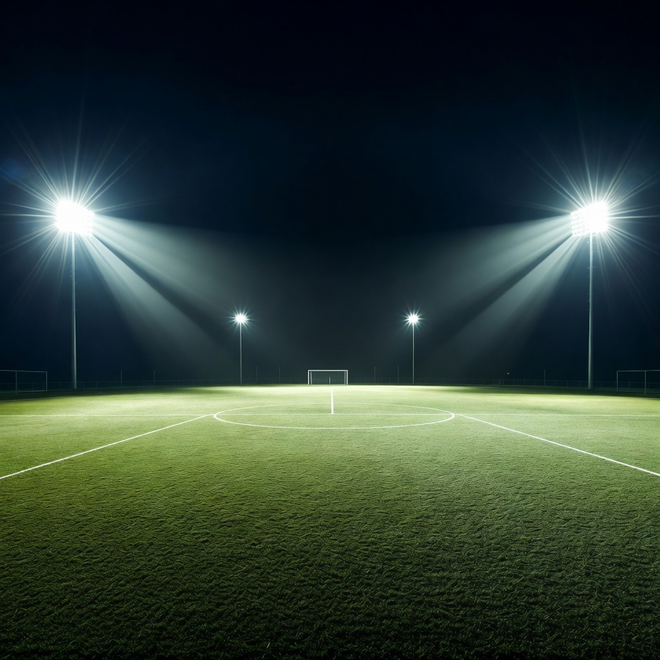 A soccer field glows under bright floodlights at night. White goalposts stand at one end of the lush green turf marked with white lines. Tall light poles cast dramatic beams across the empty pitch.
