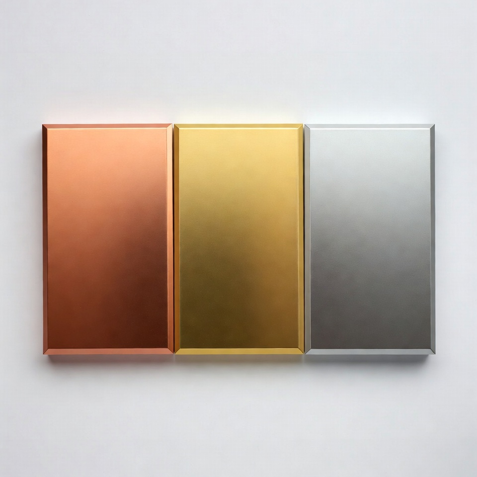 Three rectangular metal panels in copper, gold, and silver colors are arranged side by side on a white background. Each panel features a smooth, metallic gradient finish with beveled edges. The panels are evenly spaced and isolated against the plain backdrop.
