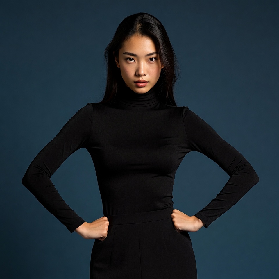 Asian, black hair, black outfit, black turtleneck, confident pose, dark blue background, female, hands on hips, long hair, portrait, professional look, sleek outfit, standing pose, stylish clothing, turtleneck, woman, young woman, Asian woman