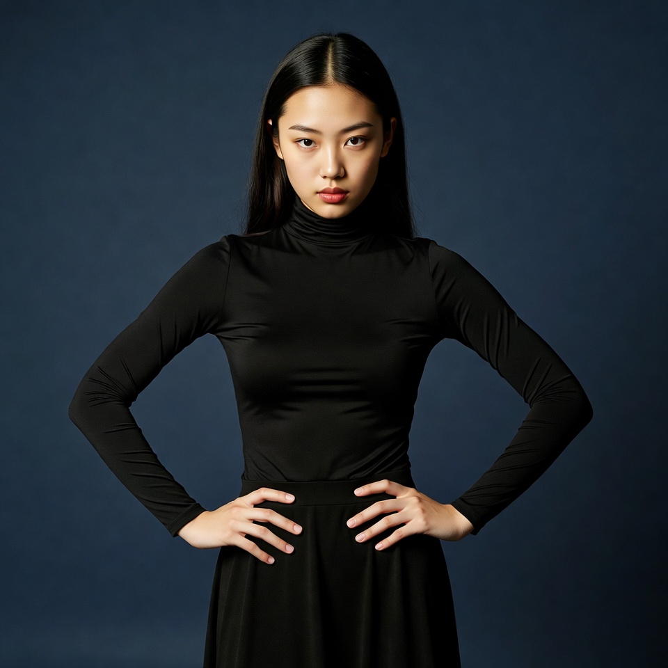 black skirt, black turtleneck, confident pose, dark blue background, female, hands on hips, long black hair, long sleeves, serious expression, studio portrait, woman, young, Asian woman