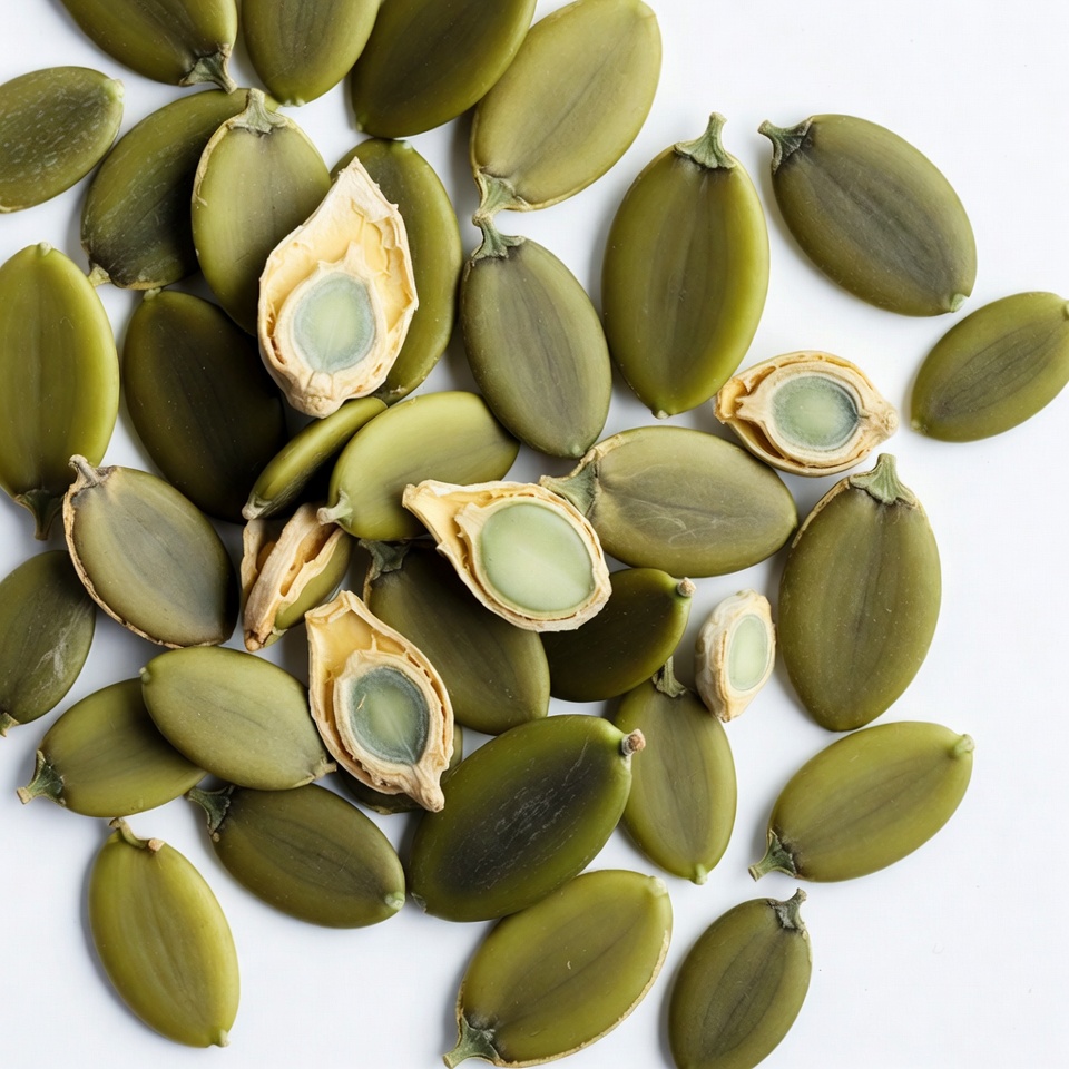A pile of green pumpkin seeds, some cracked open to reveal white interiors, is scattered on a plain white background. The seeds have smooth, curved shells and are arranged in a clustered formation. The image highlights the texture and color contrast of the seeds.