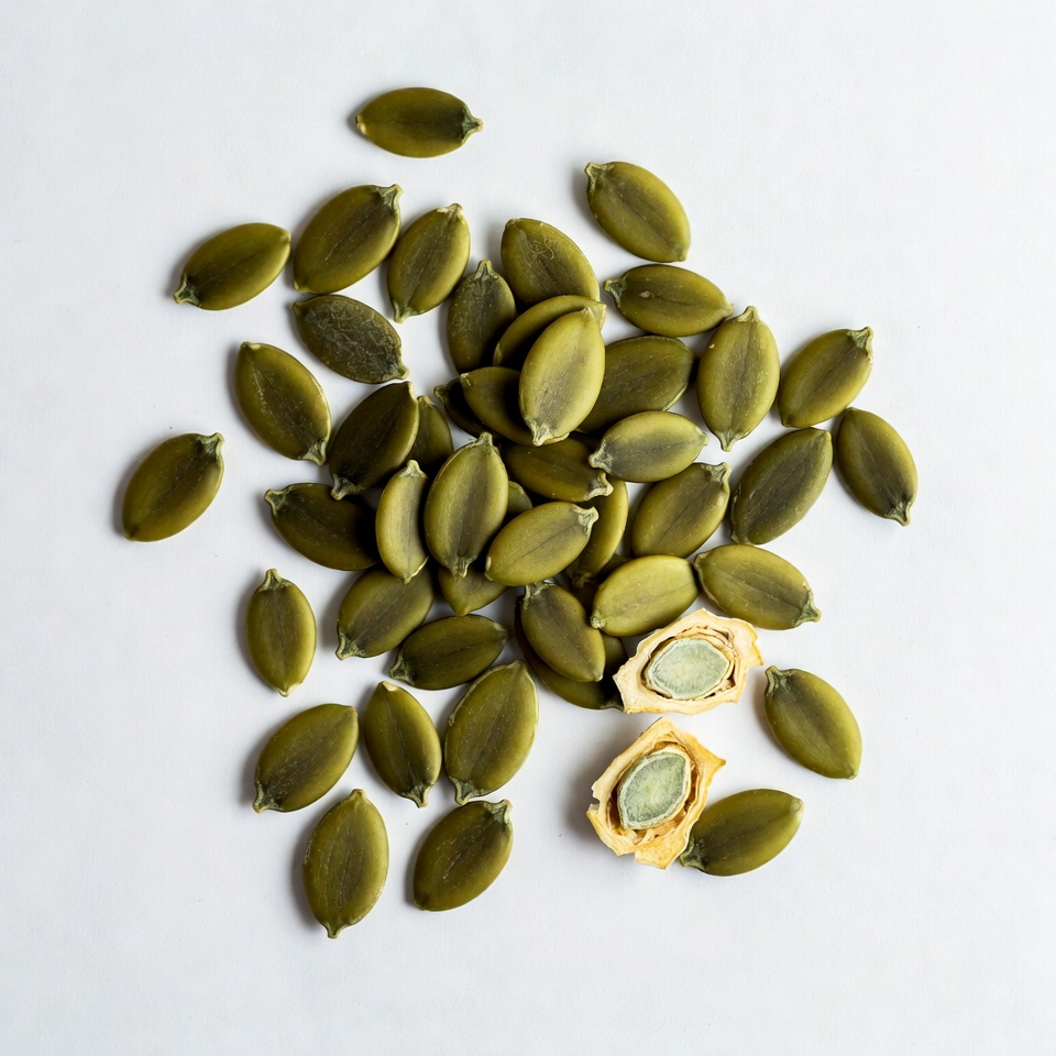 A pile of green pumpkin seeds is scattered on a plain white surface. One seed is split open, revealing the white inner flesh and seed. The seeds have smooth, curved shells and are arranged in a clustered formation.