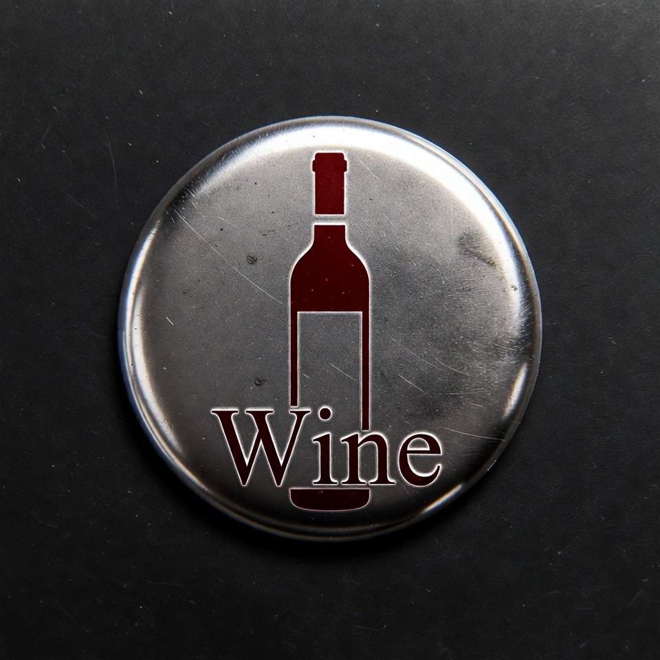 A round silver button badge features a red silhouette of a wine bottle with a cork. The word 'Wine' is printed below in bold red letters. The badge is centered against a dark background.