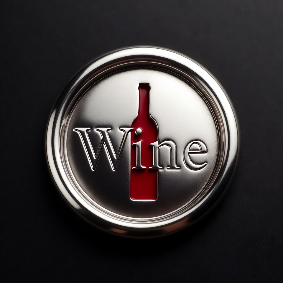 A metallic silver circular emblem features a red wine bottle silhouette in the center. The word 'WINE' is elegantly embossed above and below the bottle in stylish lettering. The design is set against a solid black background.