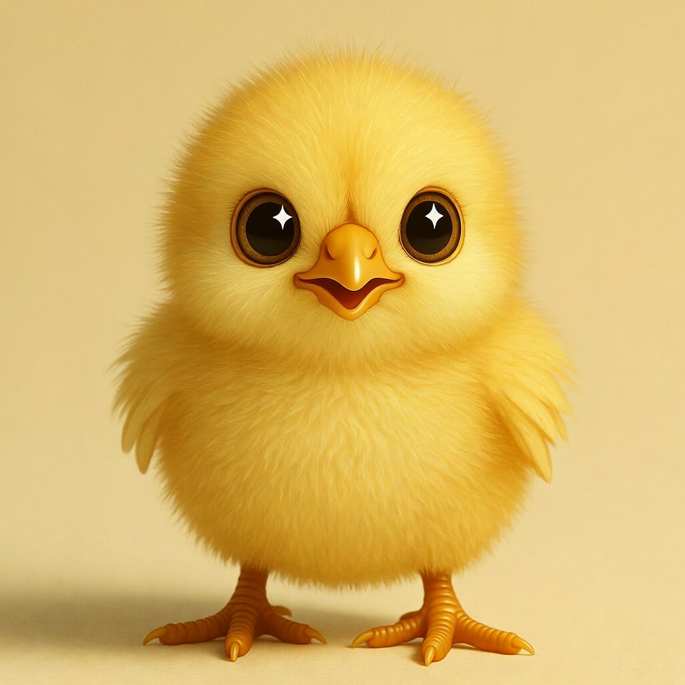 A fluffy yellow chick stands on a plain background with oversized sparkling eyes and a small beak. Its soft feathers and tiny orange feet are highly detailed in a 3D rendered style. The chick appears adorable and cartoonish.