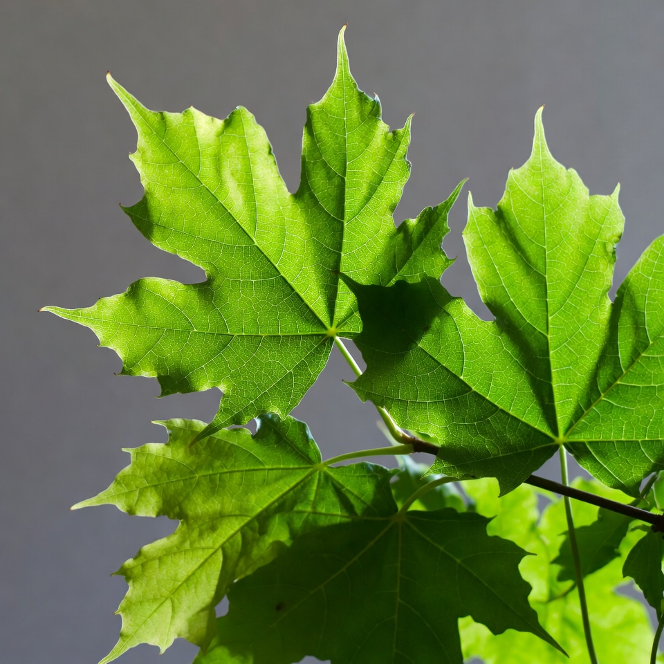 Several vibrant green maple leaves with distinct pointed lobes are arranged closely together. They feature prominent veins and are set against a smooth gray background. Sunlight highlights the edges, creating a glowing effect on the fresh foliage.