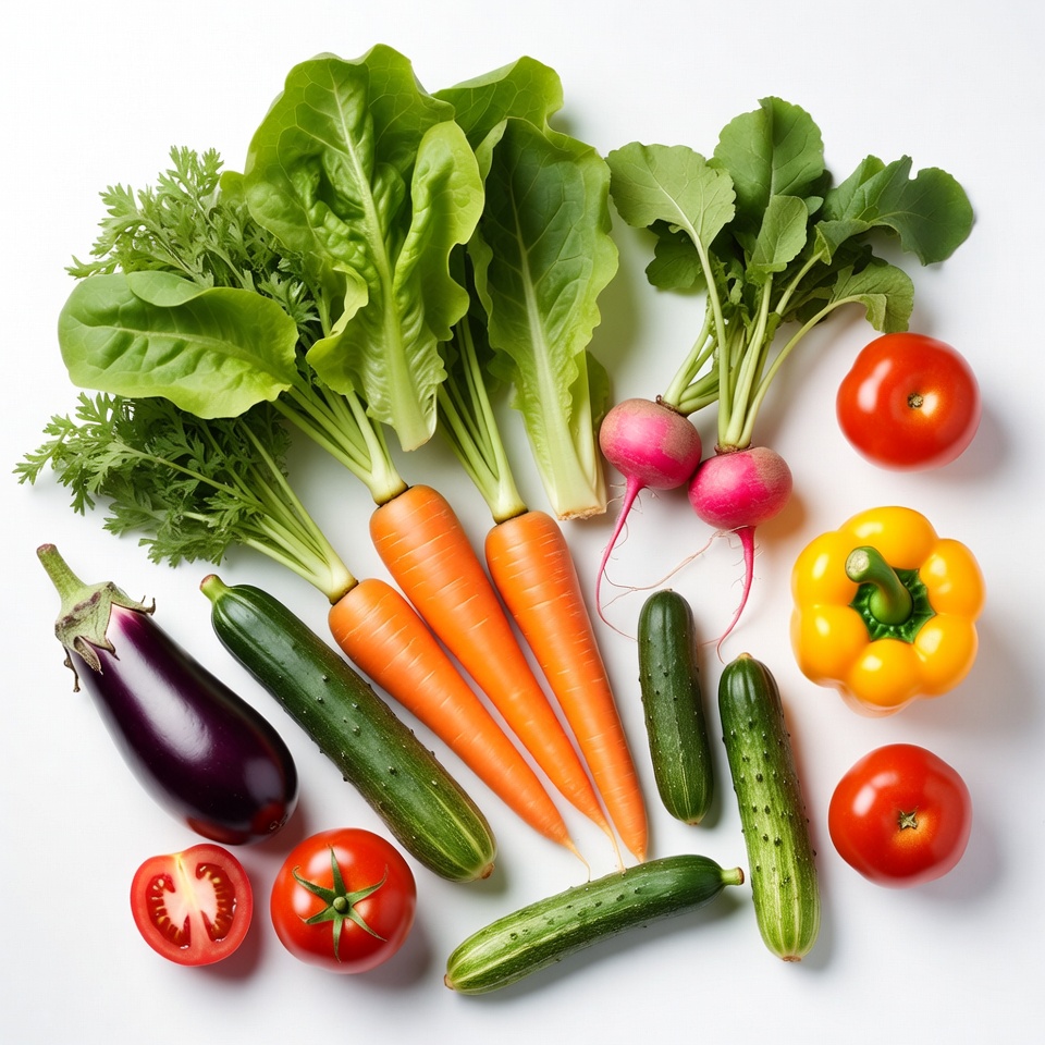 bell pepper, carrots, colorful vegetables, cucumbers, eggplant, food photography, fresh vegetables, green tops, healthy food, lettuce, organic vegetables, produce, radishes, raw vegetables, tomatoes, veggie arrangement, white background, vegetables