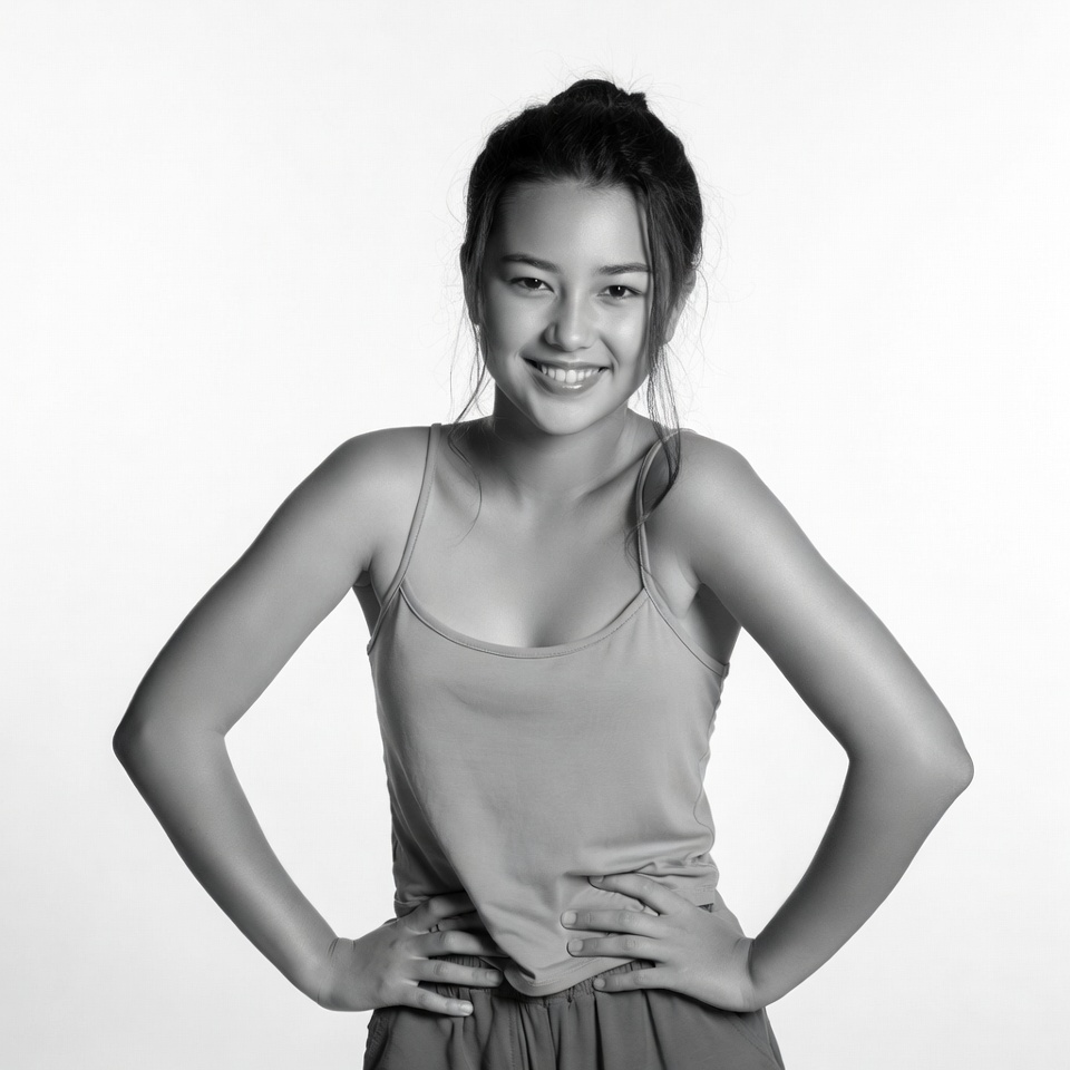 A young Asian woman with dark hair in a bun smiles confidently at the camera in a black and white portrait. She wears a sleeveless tank top and loose pants, standing with arms extended and hands placed on her hips against a plain white background. Her expression is cheerful with bright eyes and a wide smile.