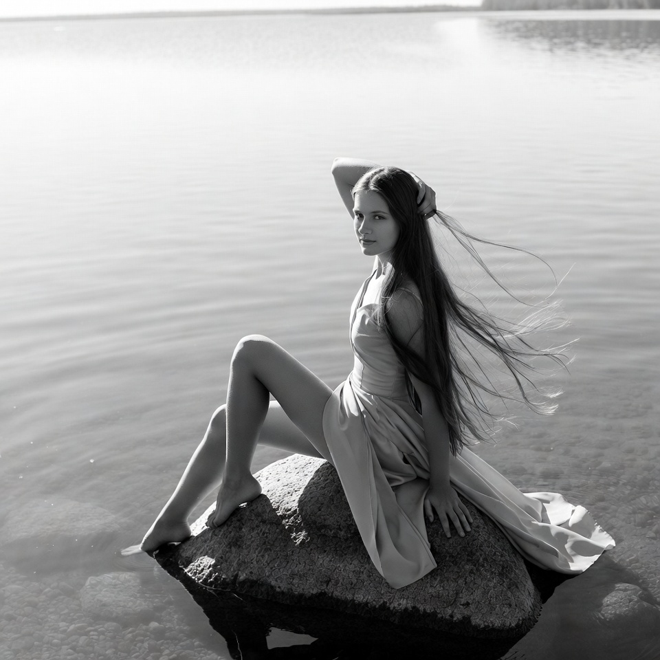 A young woman with long flowing hair sits on a large rock at the edge of a calm lake. She wears a light dress that drapes over the rock and into the water, with one hand touching her hair. The image is in black and white, capturing the serene water and misty horizon.