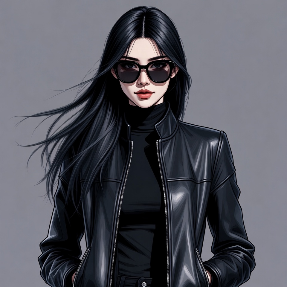 Asian, black hair, black outfit, confident pose, cool look, dark sunglasses, digital art, fashion, female, flowing hair, gray background, hands in pockets, illustration, leather jacket, long hair, portrait, red lips, stylish, sunglasses, turtleneck, young woman, woman