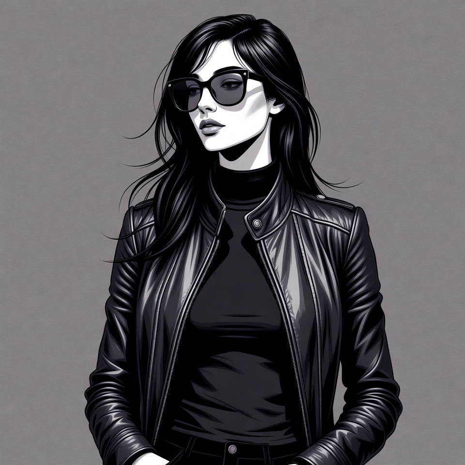 A stylized illustration of a woman with long flowing black hair wears oversized black sunglasses and a sleek black leather jacket over a black turtleneck. She stands confidently with hands in pockets against a plain gray background. Her expression is cool and direct, gazing slightly to the side.