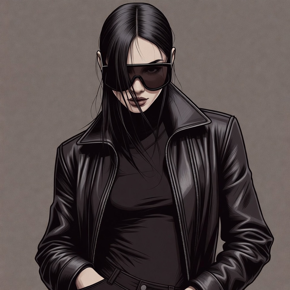 Asian, anime style, black clothing, black hair, black outfit, confident pose, cool woman, cyberpunk, digital art, edgy style, fashion, female, gray background, hands in pockets, high collar, illustration, leather jacket, long hair, oversized sunglasses, portrait, stylish, sunglasses, turtleneck, young woman, woman