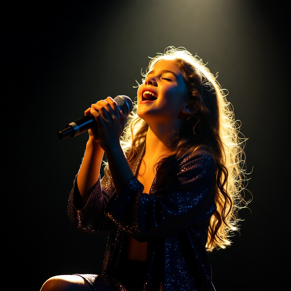 A young girl with long wavy hair sings passionately into a microphone under dramatic spotlights. She wears a sparkly dark dress and sits on stage with a black background. Her face shows joy as golden light illuminates her performance.