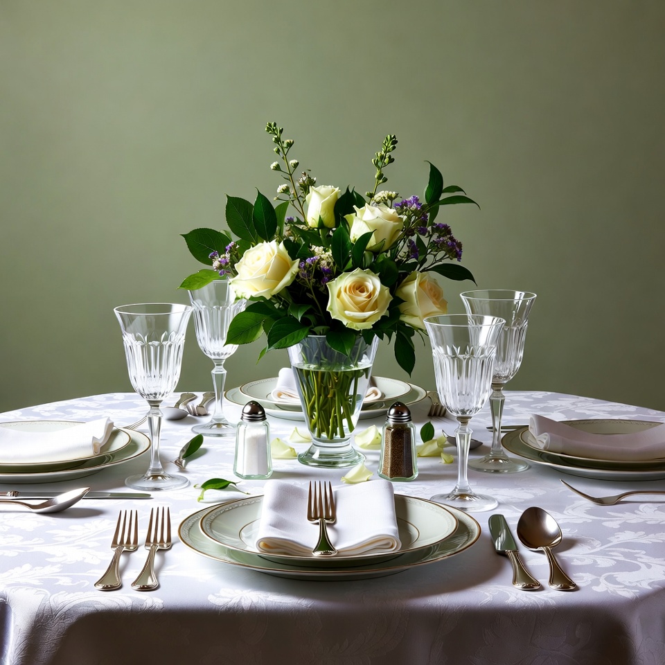 A bouquet of white roses and purple flowers stands in a clear glass vase at the center of a round white tablecloth. Flanking the centerpiece are two pairs of tall clear wine glasses, white plates, shiny silverware, and small salt and pepper shakers. The table is set against a soft green background.