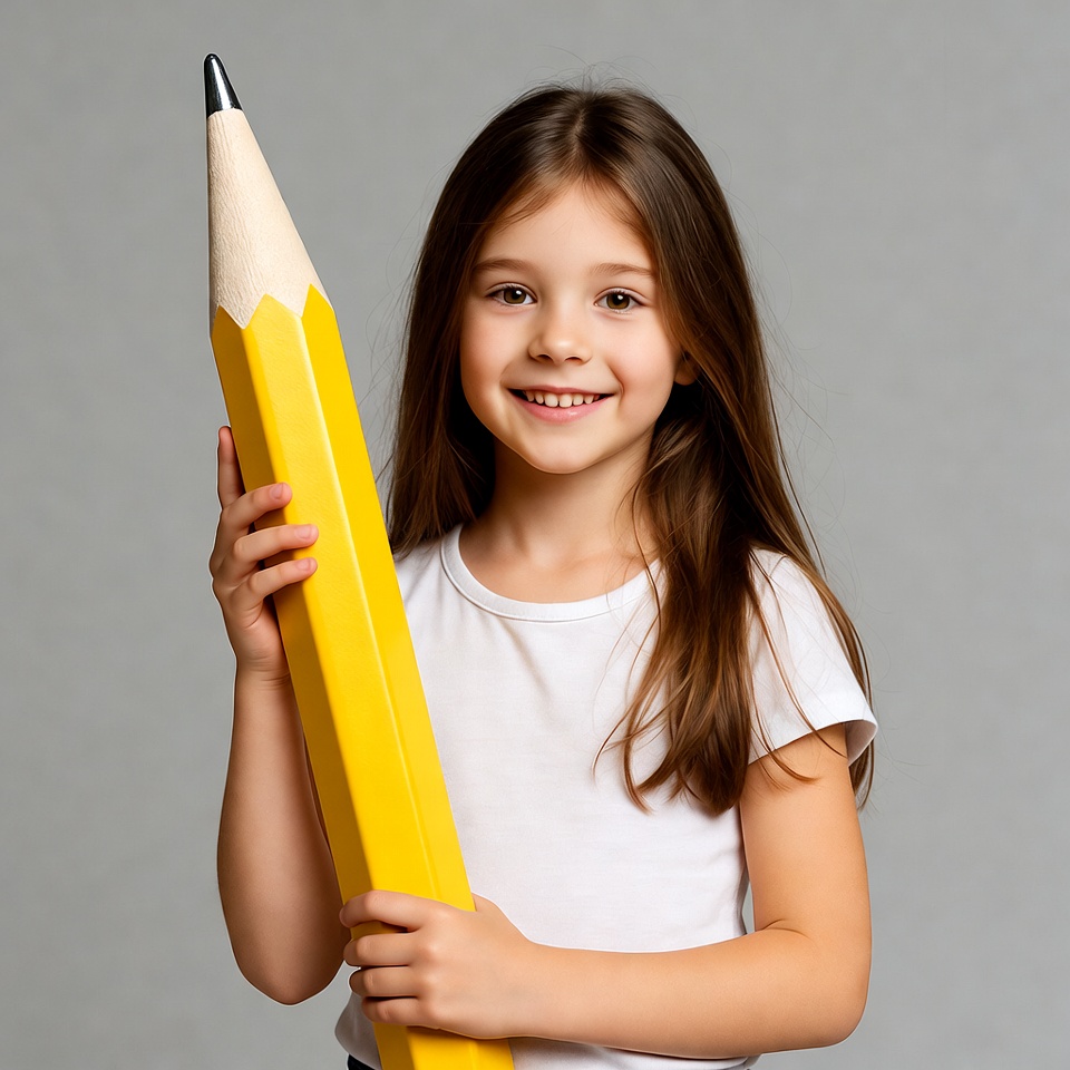 A young girl with long brown hair smiles while holding a large yellow pencil that towers over her. She wears a white short-sleeved t-shirt and stands against a plain gray background. The oversized pencil has a black tip and pink eraser.
