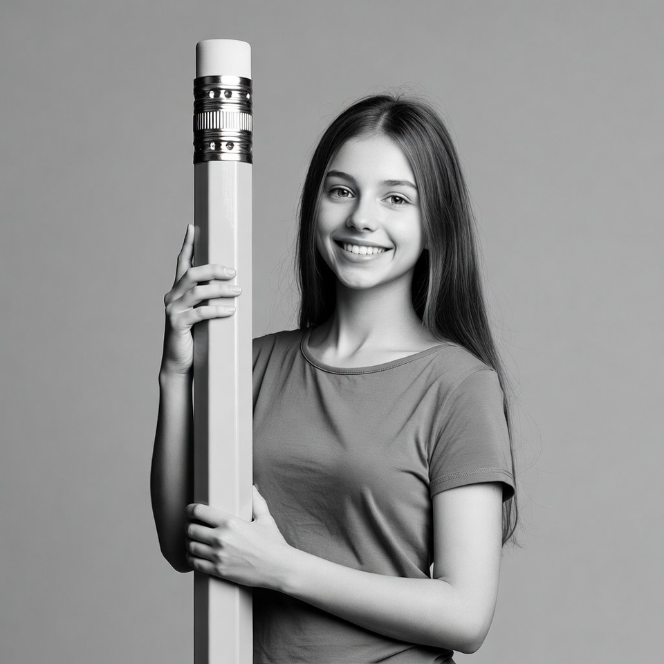 A young woman with long straight hair smiles while holding a large white pencil with black tip and stripes vertically in front of her. She wears a short-sleeved gray t-shirt and stands against a plain gray background. The image is in black and white.