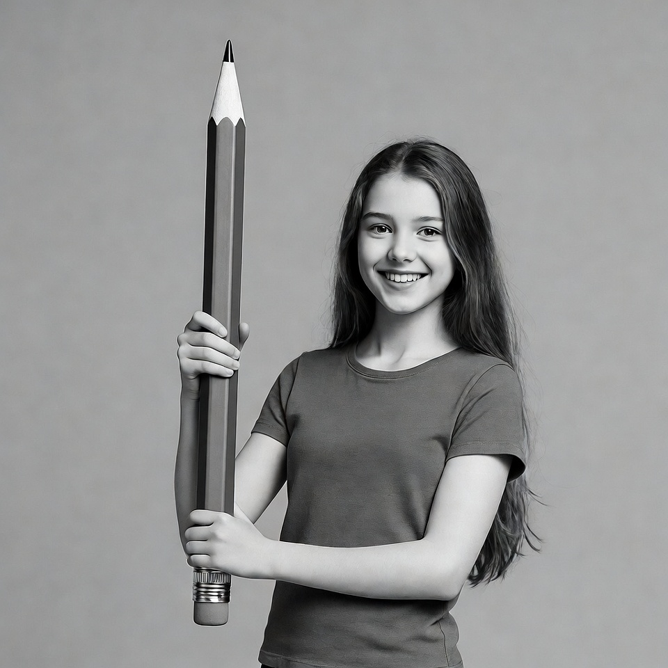 A young girl with long brown hair smiles while holding a large black and white pencil with both hands. She wears a short-sleeved gray t-shirt and stands against a plain gray background. The oversized pencil extends above her head, with a sharp tip and eraser visible.