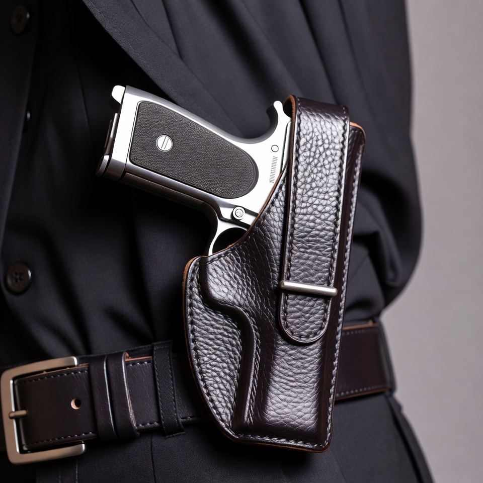 A man wearing a black suit stands with a silver pistol holstered on his belt. The leather holster is brown and positioned on his right side. The image focuses on the holster and gun from a side angle against a plain background.