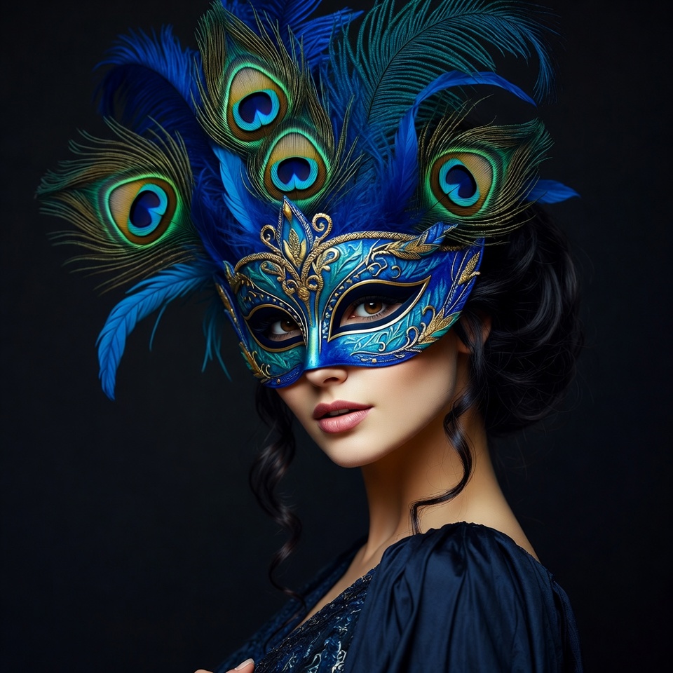 A woman with dark wavy hair wears an ornate blue Venetian mask adorned with vibrant peacock feathers. She has subtle makeup and a neutral expression, dressed in a dark blue gown. The image is set against a black background, highlighting the mask and feathers.