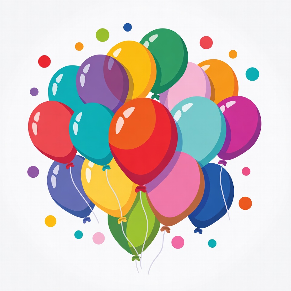 A vibrant cluster of illustrated balloons in various colors including red, yellow, green, blue, purple, and pink floats against a white background. The balloons are shiny and rounded, arranged in a tight bunch with strings dangling below. Small dots of color surround the main group.