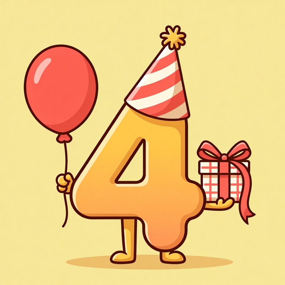 birthday, bow, cartoon, clipart, festive, four, gift box, illustration, isolated background, party hat, red balloon, striped hat, yellow background, number 4