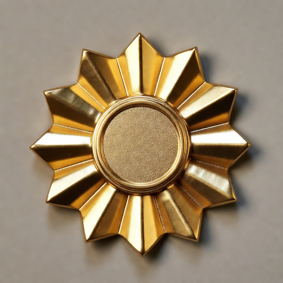 A shiny gold star-shaped medal features eight sharp points radiating from a central circular area. The center circle is blank and slightly textured, surrounded by a smooth gold rim. The medal is displayed against a plain gray background.