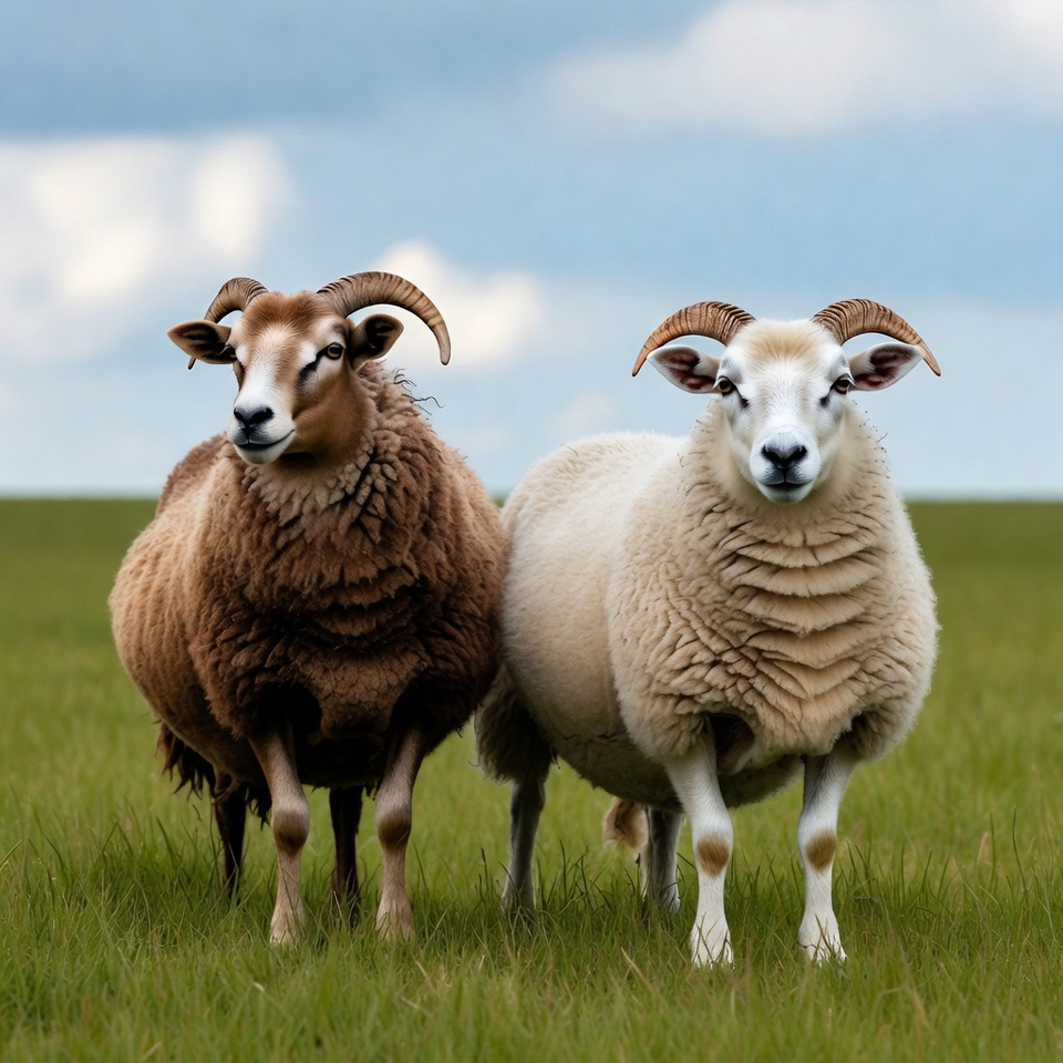 A brown ram with curved horns stands next to a white ram with curved horns in a lush green field. Both sheep face forward with alert expressions under a partly cloudy sky. Their thick woolly coats are prominent against the grassy background.