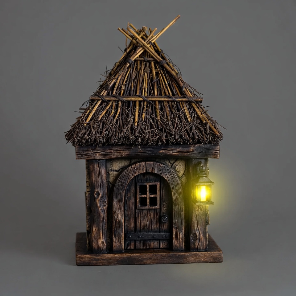 A small wooden fairy house features a pointed thatched roof made of straw and textured log walls. An arched wooden door with a small window sits at the front, illuminated by a glowing lantern hanging beside it. The house stands on a wooden base against a plain gray background.