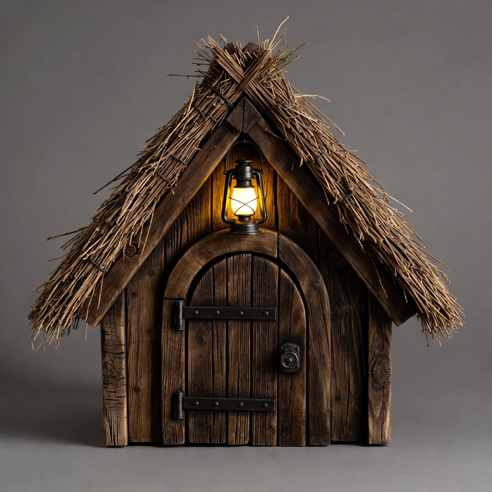 A small wooden house with a steeply pitched thatched roof sits on a gray background. A glowing lantern hangs from the eaves above the arched wooden door with iron hinges and latch. The rustic structure features dark wood planks and dense straw thatching.