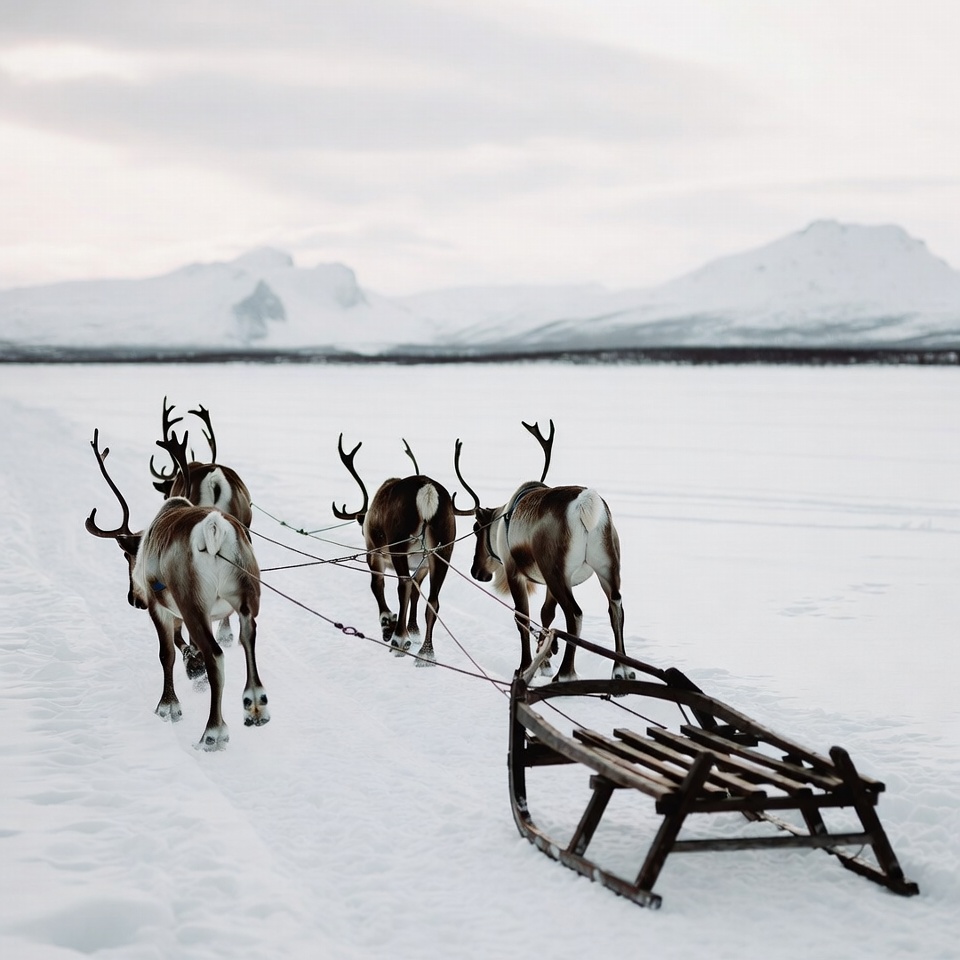 Arctic scene, animals, cloudy sky, cold weather, frozen plain, harnessed reindeer, mountains, pulling sled, sled, snow, snowy landscape, team of reindeer, winter, wooden sled, reindeer