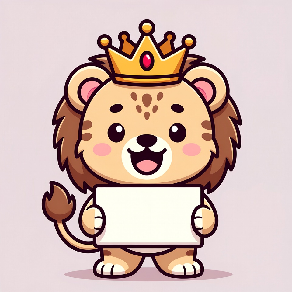 adorable animal, animal, baby lion, big eyes, blank sign, cartoon lion, chibi style, clipart, cute lion, fluffy mane, golden crown, holding sign, illustration, isolated background, kawaii lion, lion with crown, smiling lion, vector art, white sign, lion cub