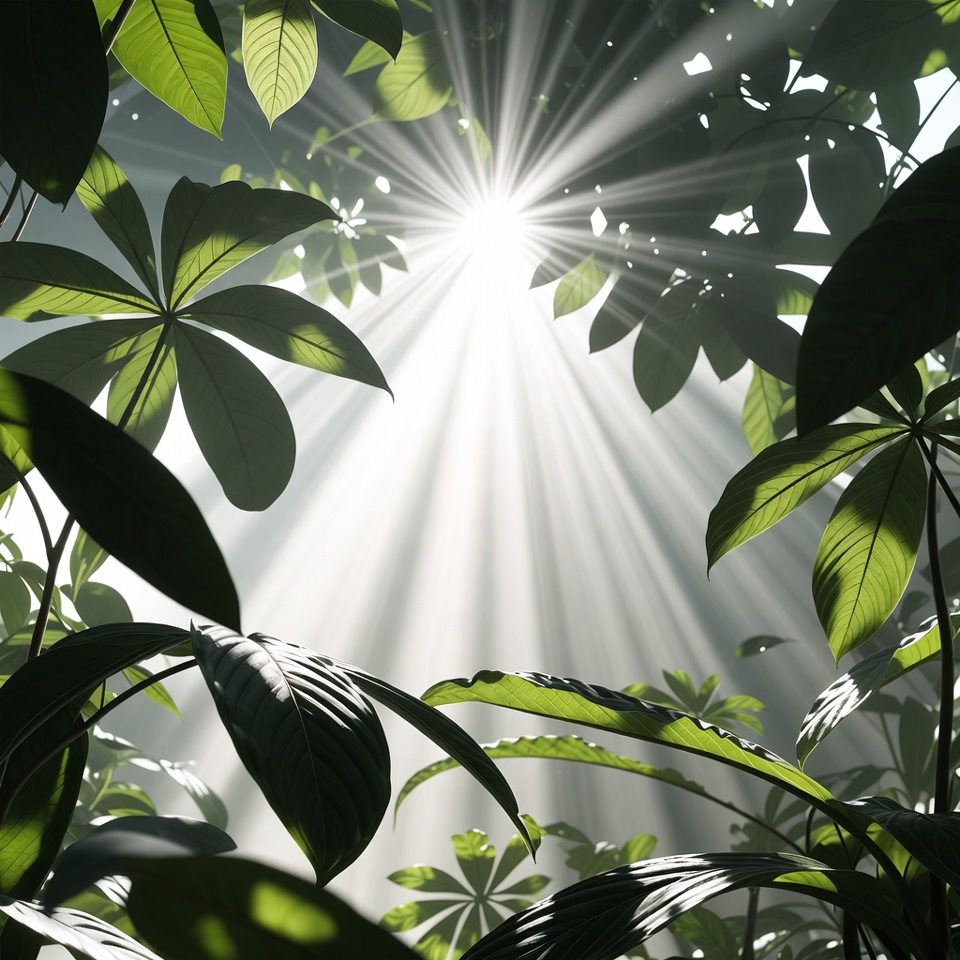 bright light, foliage, forest, glowing sun, green leaves, illustration, isolated background, jungle, leaf veins, lush greenery, nature, plants, schefflera, sun rays, sunbeams, tropical leaves, tropical plants, sunlight