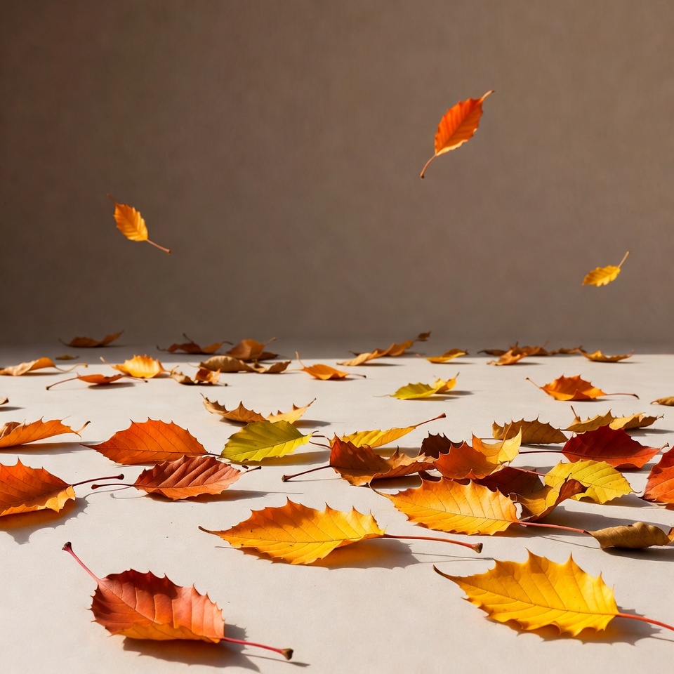 Numerous orange and yellow autumn leaves are scattered across a light beige surface with some floating in the air. The leaves display vibrant fall colors and detailed veins against the neutral backdrop. The composition emphasizes the dynamic motion of the falling foliage.