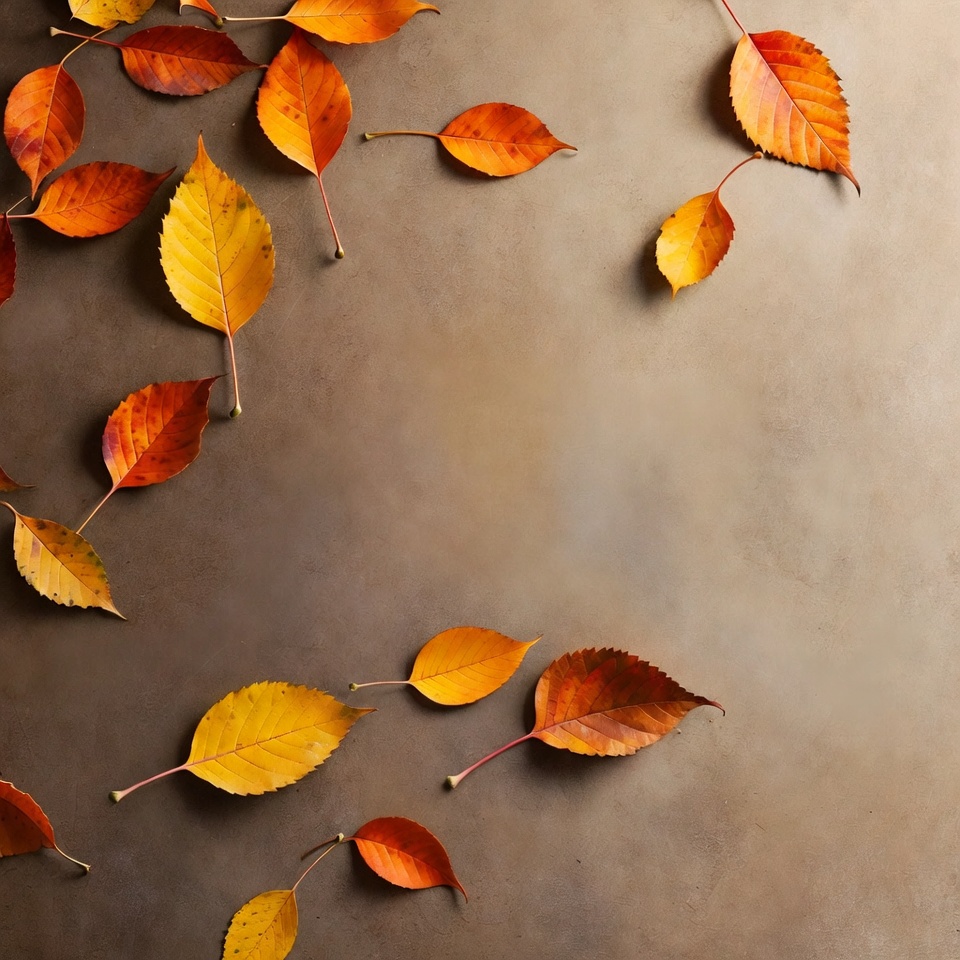 Scattered orange and yellow autumn leaves form a curved pattern on a textured beige background. The leaves feature detailed veins and stems, arranged in a loose border design. The composition leaves ample negative space in the center.