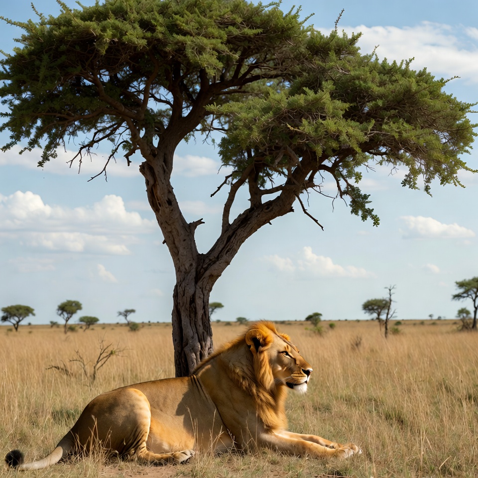 Africa, African lion, acacia tree, animals, big cat, blue sky, clouds, feline, flat-top tree, golden grass, grass, grassland, horizon, mammal, nature, predator, resting lion, safari, savanna, tree canopy, wild animal, wildlife, lion