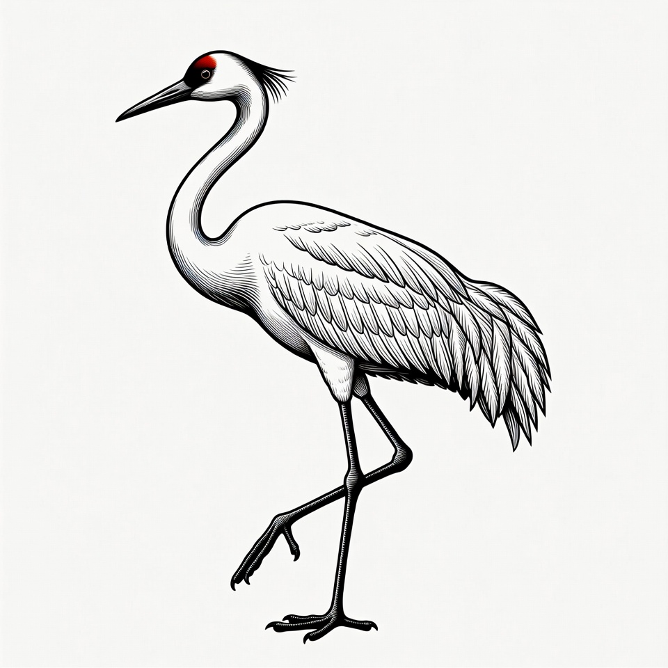 avian, bird clipart, bird illustration, black legs, crane bird, detailed drawing, elegant bird, feathers, isolated background, line art, long beak, long neck, one leg, red crown, standing bird, vector art, wading bird, white crane, wildlife art, sandhill crane
