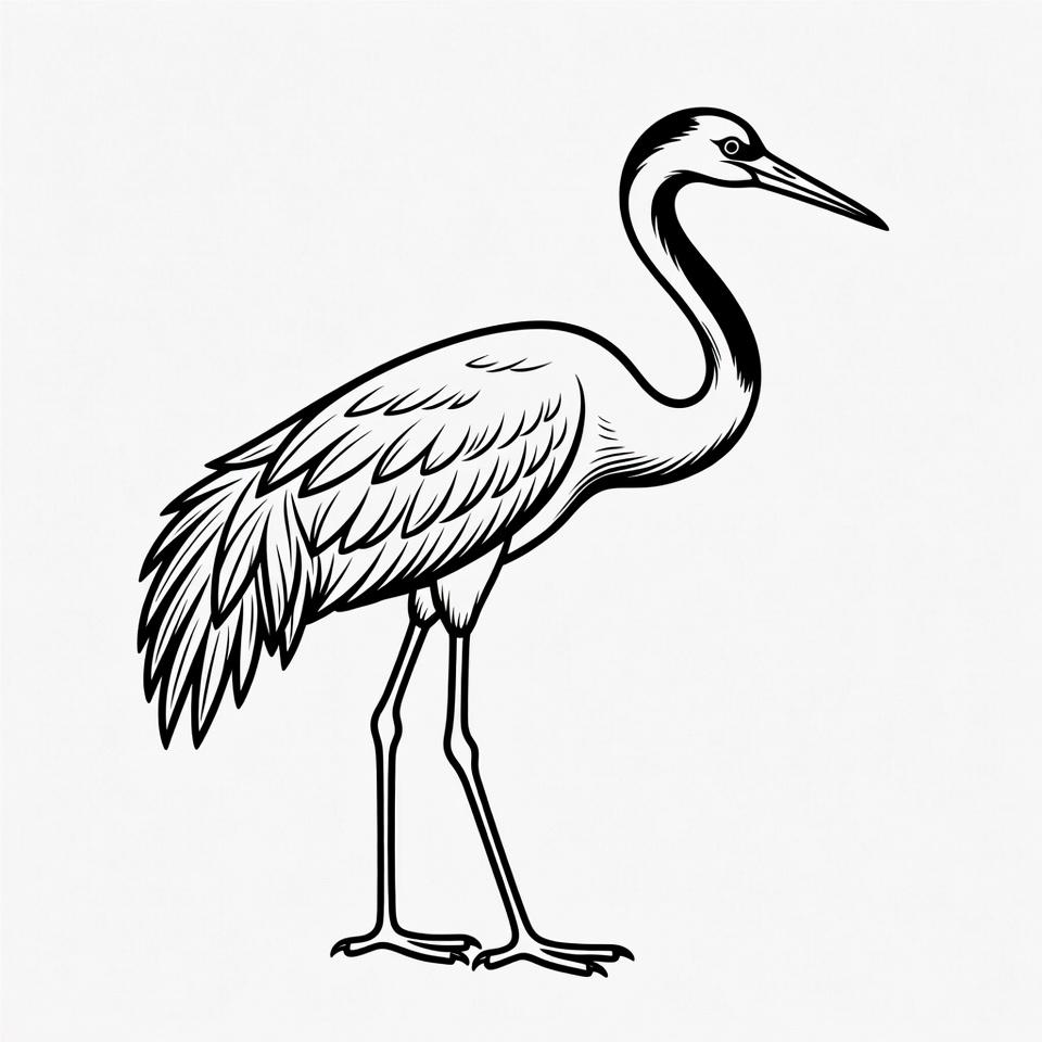 A detailed line art illustration of a crane standing on one leg. The bird features a long neck, sharp beak, and intricate feather patterns in black ink on a white background. It is depicted in a side profile with elegant, elongated legs.