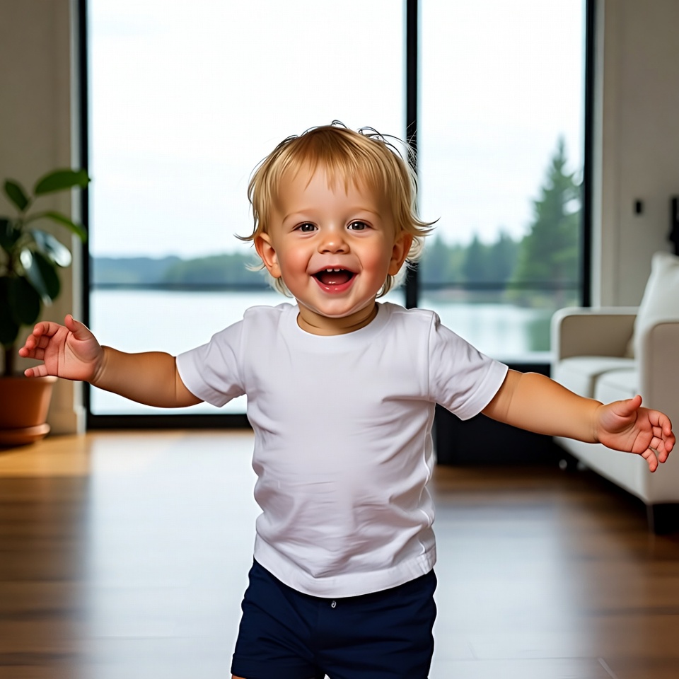 A happy blond toddler boy with curly hair stands in a modern living room, smiling widely with arms spread open. He wears a white t-shirt and navy shorts. Large windows behind him reveal a view of a lake and trees, with houseplants and a beige sofa nearby.