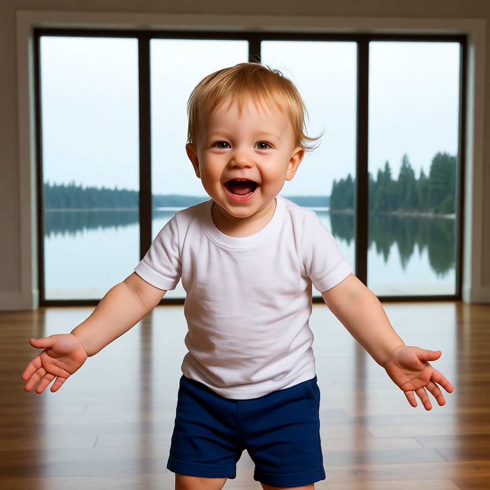 A joyful baby boy with blonde hair stands in a modern living room, wearing a white onesie and blue shorts. He smiles widely with arms extended, facing large windows that reveal a serene lake and pine trees outside. The wooden floor and glass doors frame the scene.