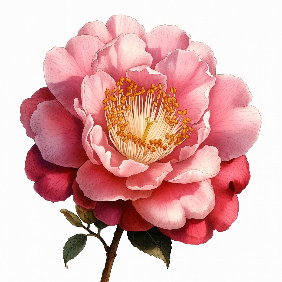 bloom, botanical, floral, flower, garden flower, green leaves, illustration, isolated, leaves, orange stamens, peony flower, petals, pink flower, pink peony, ruffled petals, stamens, stem, vibrant, white background, peony