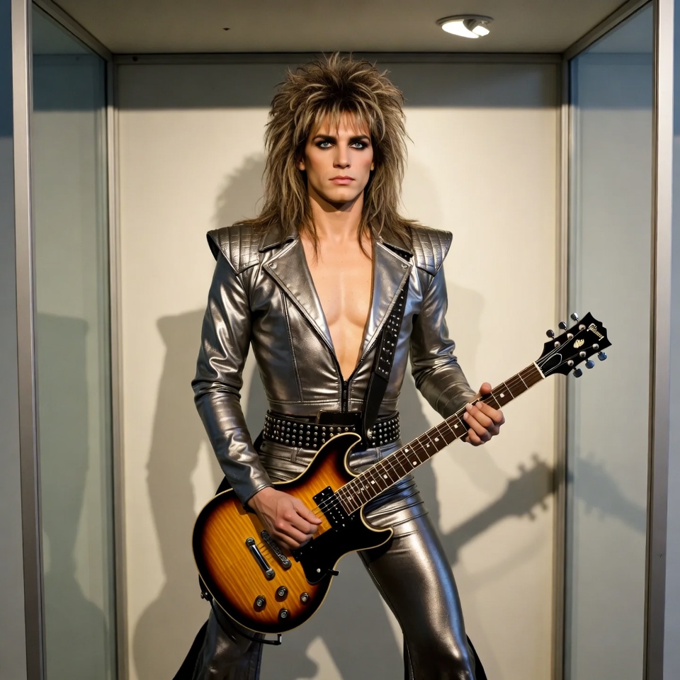 80s style, White, blonde hair, display case, electric guitar, feathered hair, flared pants, glam rock, glass case, holding guitar, leather jumpsuit, long hair, male, musician, portrait, rockstar, shiny clothing, shoulder pads, silver outfit, studio photo, studs, white background, man