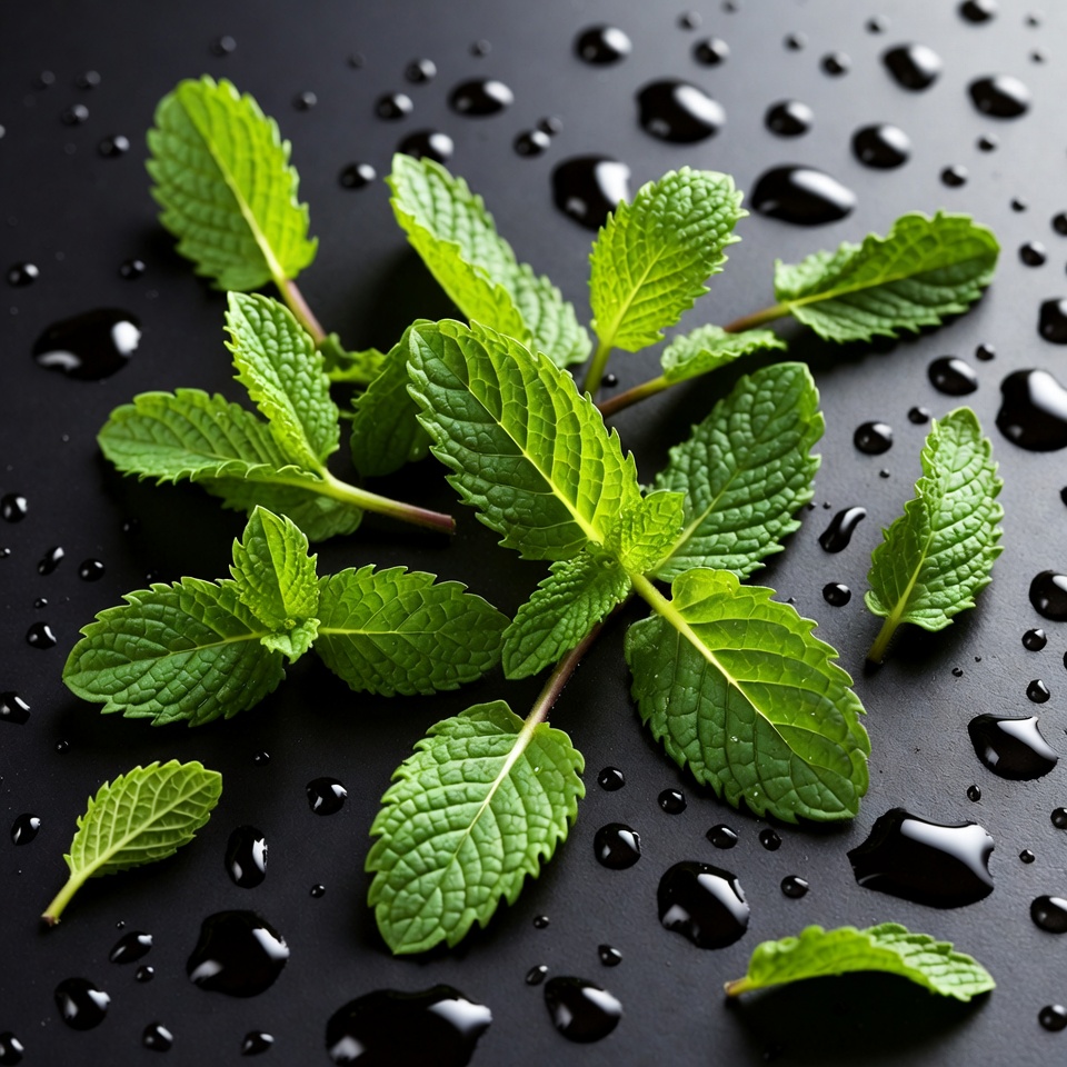 Several vibrant green mint leaves are scattered on a glossy black surface. Water droplets glisten on the leaves and background, highlighting their fresh texture and serrated edges. The composition emphasizes the plant's natural details against the dark backdrop.