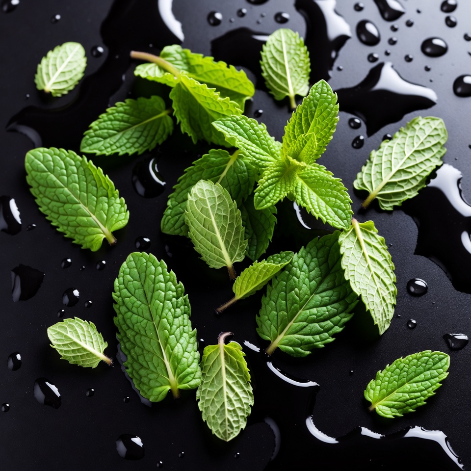 Fresh green mint leaves are scattered across a glossy black surface with water droplets. The leaves feature detailed veins and vibrant color, arranged in a cluster. The wet background enhances the shiny, reflective texture.