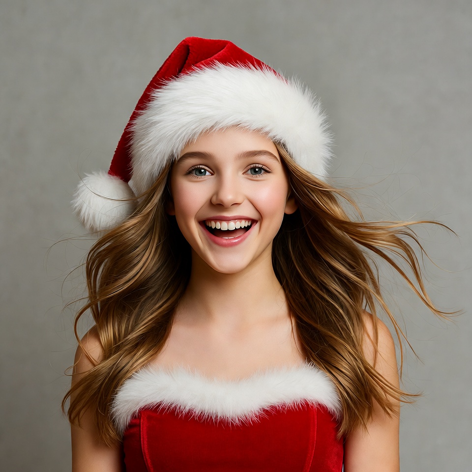 A young girl with long wavy brown hair smiles broadly while wearing a red Santa hat with white fur trim. She has on a red velvet Santa dress with white fur accents and stands against a plain gray background. Her hair flows dynamically around her face.
