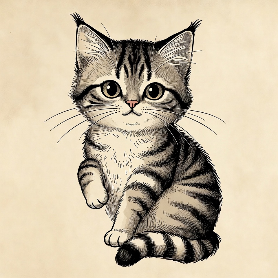 An adorable tabby kitten with grey and white stripes sits playfully on a beige background. The detailed ink-style drawing features large expressive eyes, fluffy fur, and raised paws. Fine lines highlight the whiskers, ears, and striped tail.