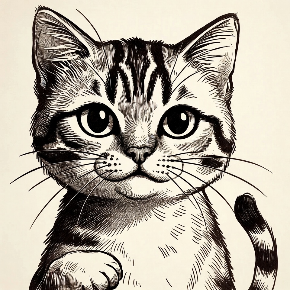 A detailed black and white line drawing of a cute tabby kitten with wide eyes and whiskers. The kitten has striped fur on its face, ears, and paws, and is shown in a close-up view. It features a playful expression with a slight smile.