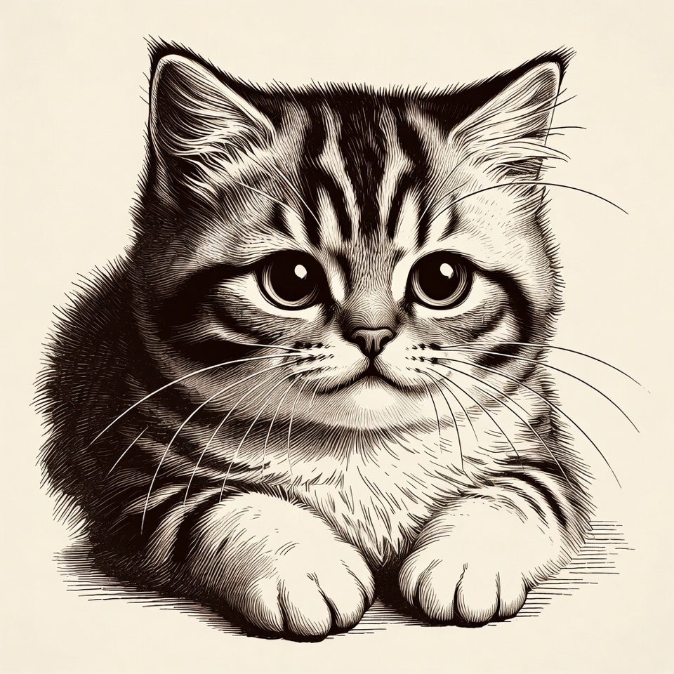 A detailed black and white illustration of a cute tabby kitten with wide eyes and whiskers. The kitten sits with front paws extended forward on a plain background. Fine lines capture the fluffy fur texture and striped pattern.
